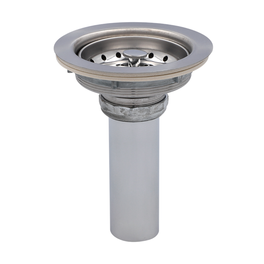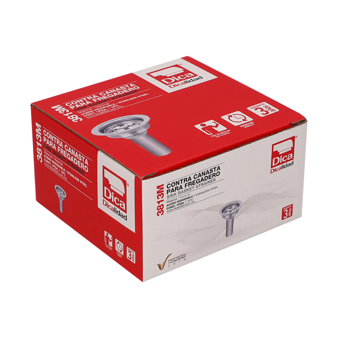 Juego de contracanasta para fregadero de la marca DICA, modelo 3813M; fabricada en acero inoxidable con tubo de latón y piezas de DELRIN (resina termoplástica de alta resistencia). La canastilla es desmontable, lo que facilita la limpieza, y el diseño evita el paso de residuos sólidos al desagüe.